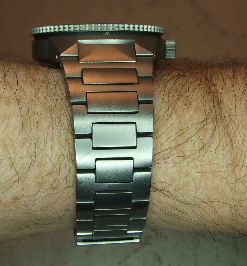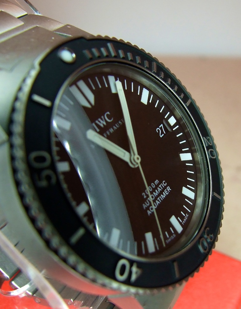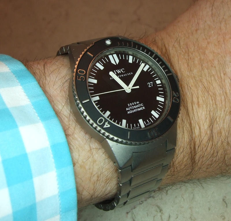 Differences: titanium versus steel, non-lumed metal bezel, non-AR coated sapphire crystal and nary a polished surface anywhere to be seen. IWC, before they got bought by the luxury group Richemont.