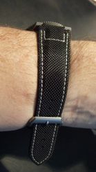 So how is it? Alas, it's the stiffest and least comfortable strap I've ever tried to wear. It's actually so unyielding that it presses on the outside wrist bone despite attempts to curve it into shape. Just getting the end of the strap into the keeper took five attempts!