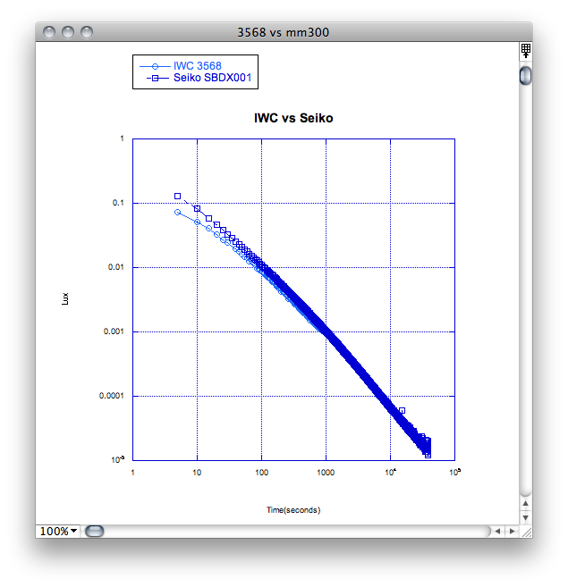 - So the IWC is almost as bright as the Seiko, but that includes the bezel so the IWC is dimmer. Both lose intensity at the same rate.