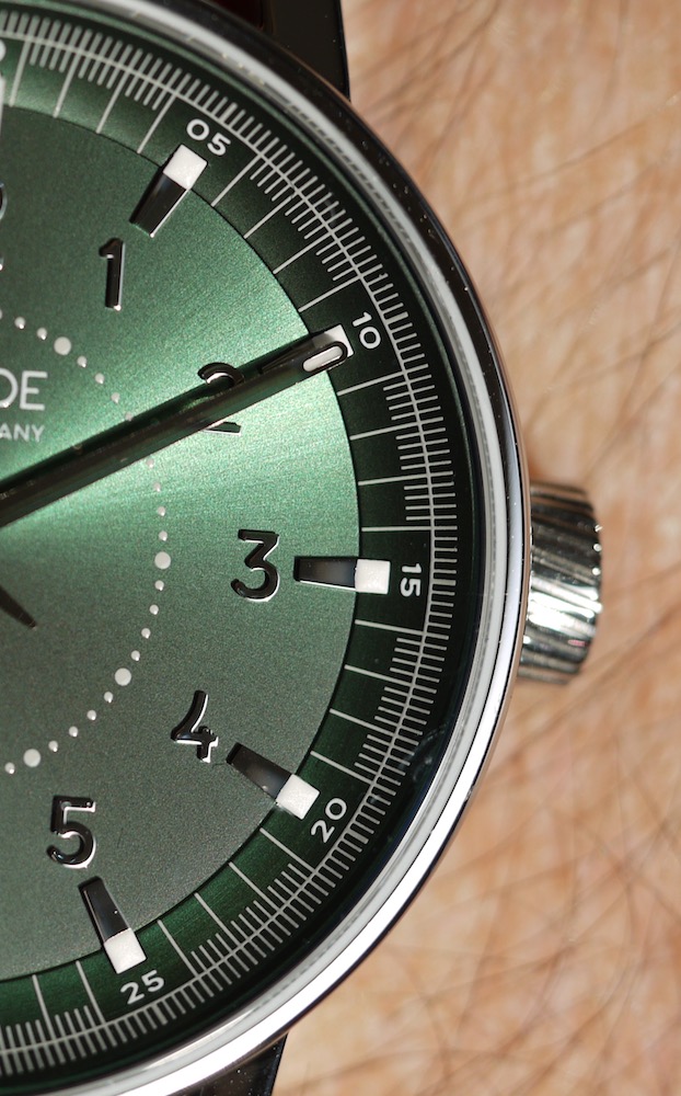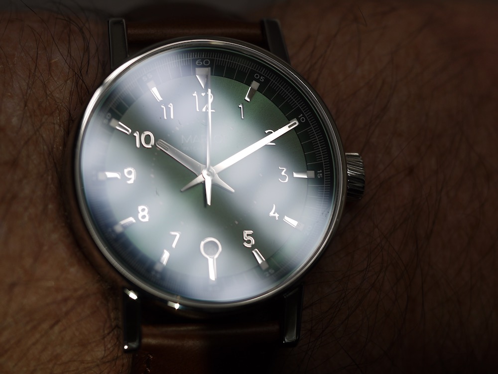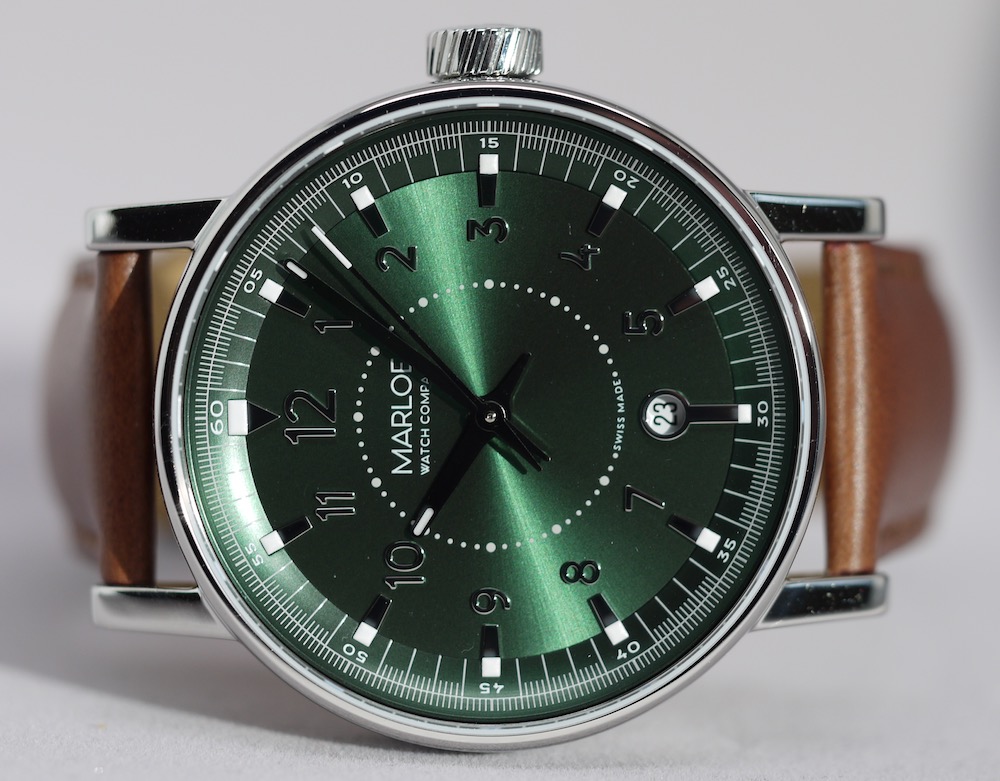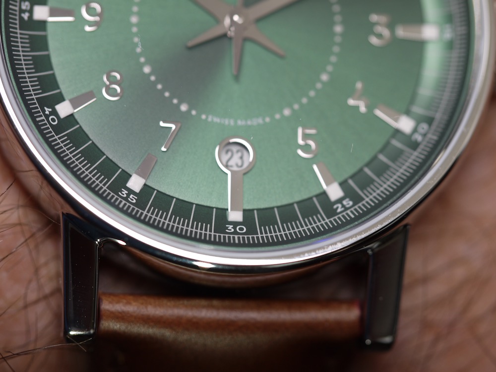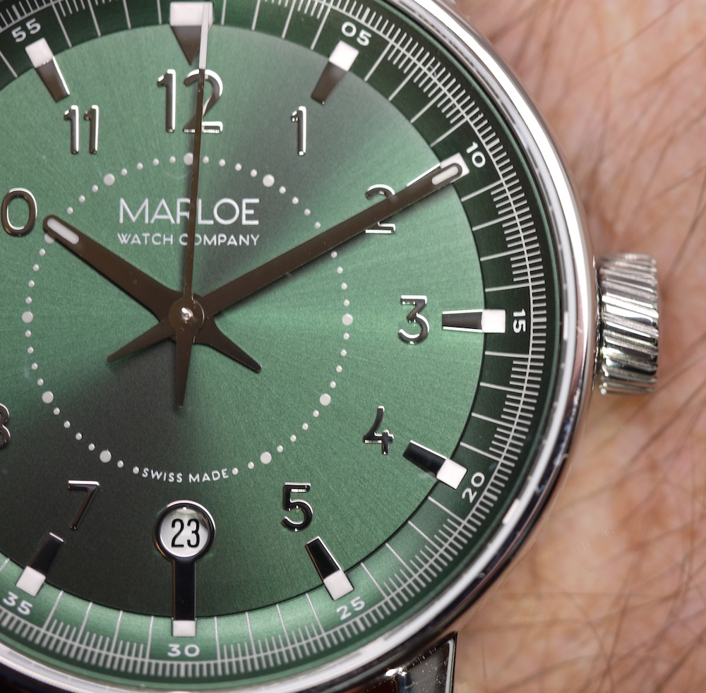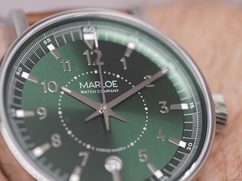 Marloe says that the dial is "inspired by the classic Land Rover green hue", sunburst-finished and edged with a unique scalloped rehaut. The markers are applied and mirror polished, and the hands are flat mirror polished with dabs of lume at the ends. It changes greatly under different lighting.