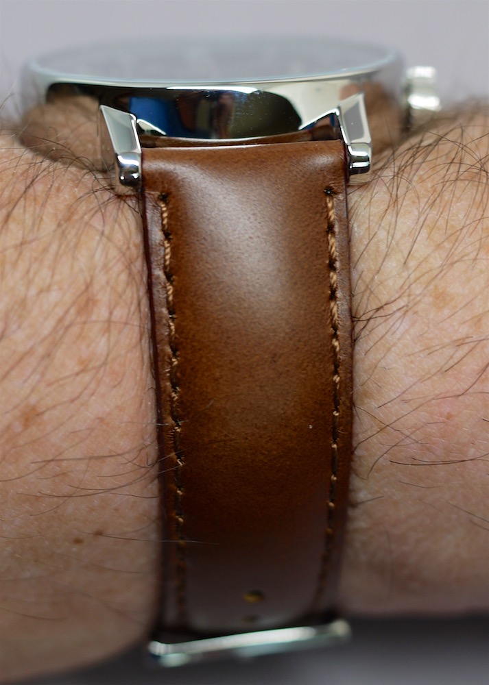 The included leather strap is Italian nubuck with a logo on the clasp. Soft, good aroma, and at 20mm the watch will have ludicrous numbers of possibilities for other straps or bracelets. They have four color choices available when you purchase the watch, so if you don't like mid-brown you can get another instead.