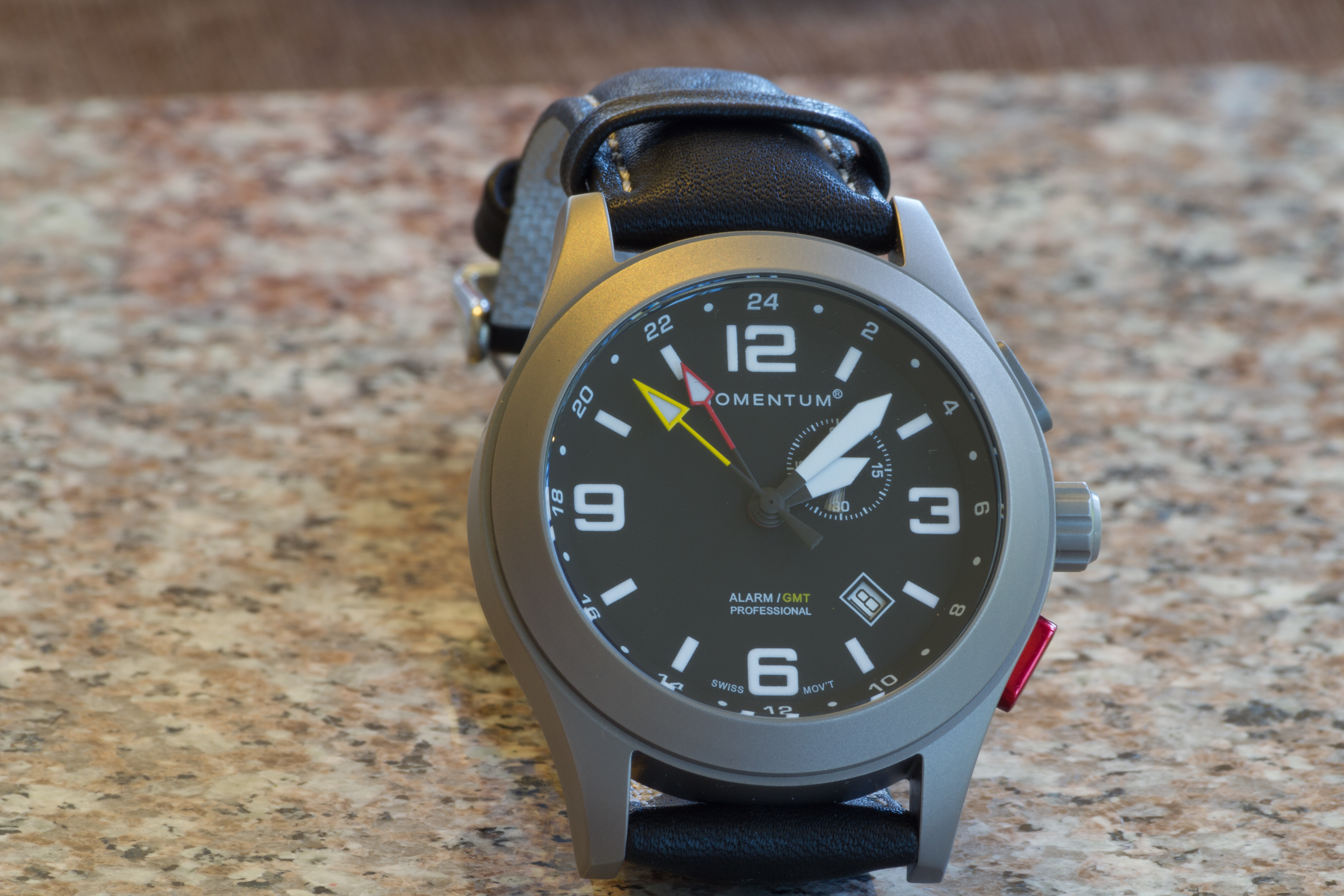 Nice GMT and alarm complications in a lightweight titanium watch. A bit bigger than I like at 44mm.