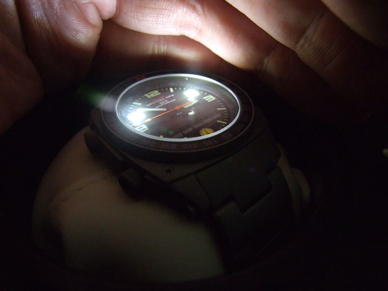 The other power-draining feature is the two white LEDs on the dial at two and ten o'clock. They look like roughly half-watt dies to me, but that's a guess. The brightness is that of a good multicell flashlight, which is hard to convey in pictures. Here's my best effort. It's bright.