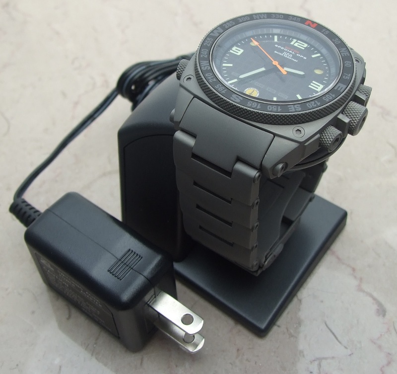All pusher have threaded collars, and the crown is screwdown too. 100m water resistant, sapphire crystal, 120-click unidirectional bezel which is kind of silly since it has a compass embossed on it. Roughly 4 months of battery life per charge, depending of course on how much you use the high-power vibration and LEDs.