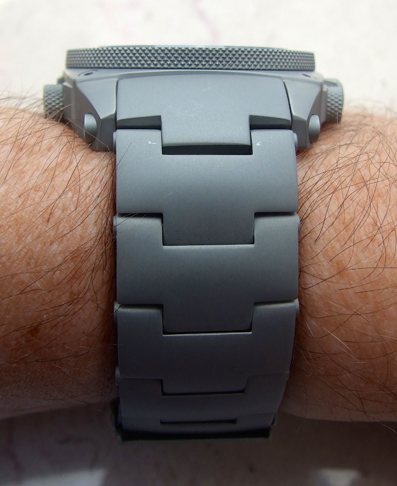 Steel case, bead-blasted grey finish. Also available in black (PVD) and brushed. 44.4mm by 15.4, 52.2 lug to lug. A chunky beast with hex-key bolt heads all over it. A very military look. The watch is 105g by itself, 240g on the bracelet with 3 links removed to fit my 7.25" wrist.