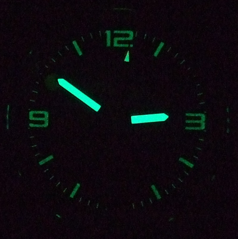Legibility is good, could be better if the hour and minute hands were bigger or a lighter paint color. Black border is a lose. Since you don't want to use the super-bright LEDs at night, it's good that a) there's a good dose of Superluminova on the hands and dial: