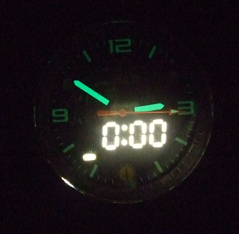 This has an analog-digital, but with LED instead of LCD. And the analog is unconnected to the digital. And it includes a vibrating alarm. (Plus another odd feature I'll get to in a minute.) The digital portion is white LED segments hidden below the dial: