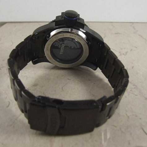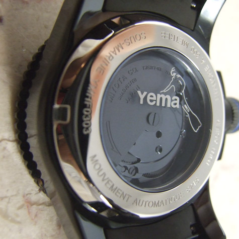 I adore what they did here with the caseback simple stainless steel ring, and a cool grey-tinted window, with a laser-etched Yema logo. Really cool for some reason.