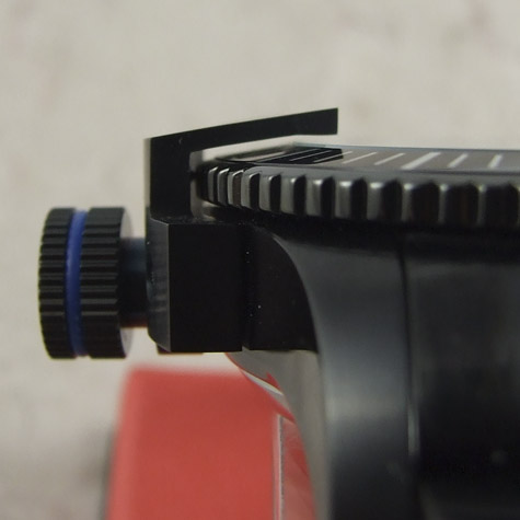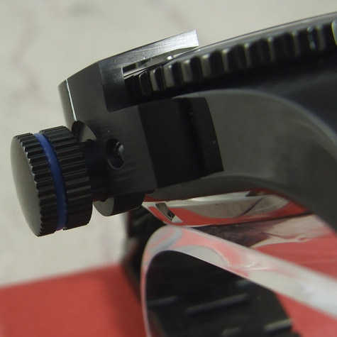 The bezel is quite interesting. 120-click ratchet, aluminum insert, bezel pip, minute gradations up to 15: all normal. What's unusual is the crown lock, where an L-shaped bracket holds the bezel in place via friction when the crown is screwed down. Here's a closeup: