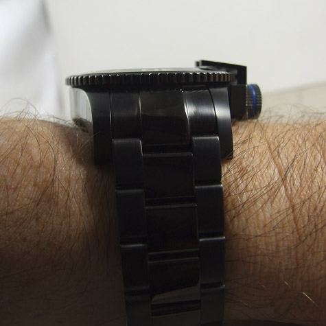 On the wrist, this is a large, heavy, tall watch. With the protruding bezel lock, it catches on sleeves and is thus best worn with short sleeves or similar. The all-black look is eye-catching and non-blingy; a good watch for the badass or wannabe. Did I say that out loud?
