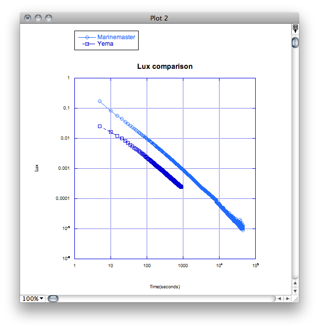 From that you can see that the Seiko is brighter and lasts longer, but for $1800 youd kind of expect that. The Yema does OK here. (See Measure luminosity and Build a UV watch illuminator, the raw datafile are online at github.