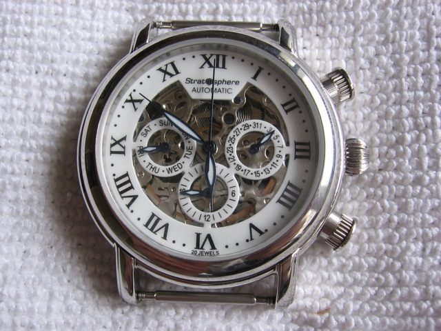 Interesting history on this one. Sold it to co-worker Moji Soltani, bought it back when he didn't like it, gave it to my mom, and the stem/crown broke some time after that. Currently in the dead-watches box. A nice cheap skeleton.