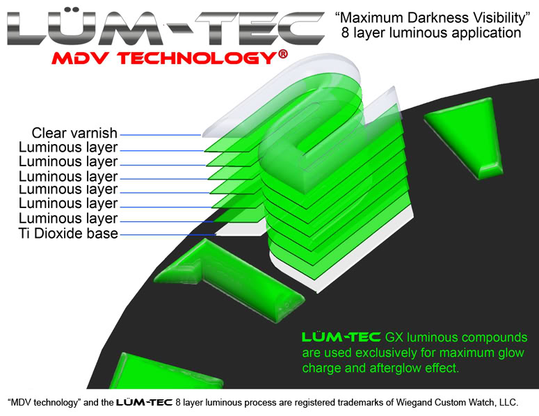 Here's a PR picture from the Lum-Tec C1, which uses six layers of superluminova: